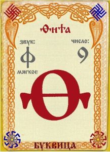 Комментарий: Фита, тридцать четвёртая буква рус. алфавита, упразднённая реформой 1917–18 гг. В кириллице имела цифровое значение 9. В глаголице ей соответствовала буква QJ («тэта») — восьмая буква греческого алфавита.
