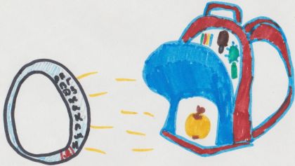 Этот рюкзак не обычный у него бесконечная вместимость.К рюкзаку идёт браслет. Он нужен чтобы, если не можешь найти вещь в рюкзаке, набери на браслете первую букву своей вещи. Из отверстия в рюкзаке выпадет вещь.
