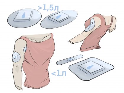 Это умный пластырь, который автоматически восполняет жидкость в организме при обезвоживании. Внутри — датчик, следящий за состоянием кожи (например, за её влажностью и электропроводностью), и микрокапсулы с изотоническим раствором (смесью воды и солей).