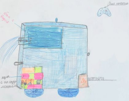 Как запустить 1. Налейте воду в бак. 2. Включите пульт (их два: один большой дома, маленький в кармане). 3. Нажмите «Старт» — камеры высунутся, просканируют грядки и скажут: «Вижу морковку, поливаю! «4. Она ездит вперёд-назад, поливает, чистит. 5. Когда будет готово, роботяпка издаст звук: «Готово, отдыхай!»