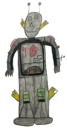 Он состоит из метала, золота и проводов. У него есть большие ноги, чтоб бегать быстро. Руки, чтобы хватать вещи. Глаза-лампочки, чтобы видеть. Батарейки внутри, чтобы работал долго.