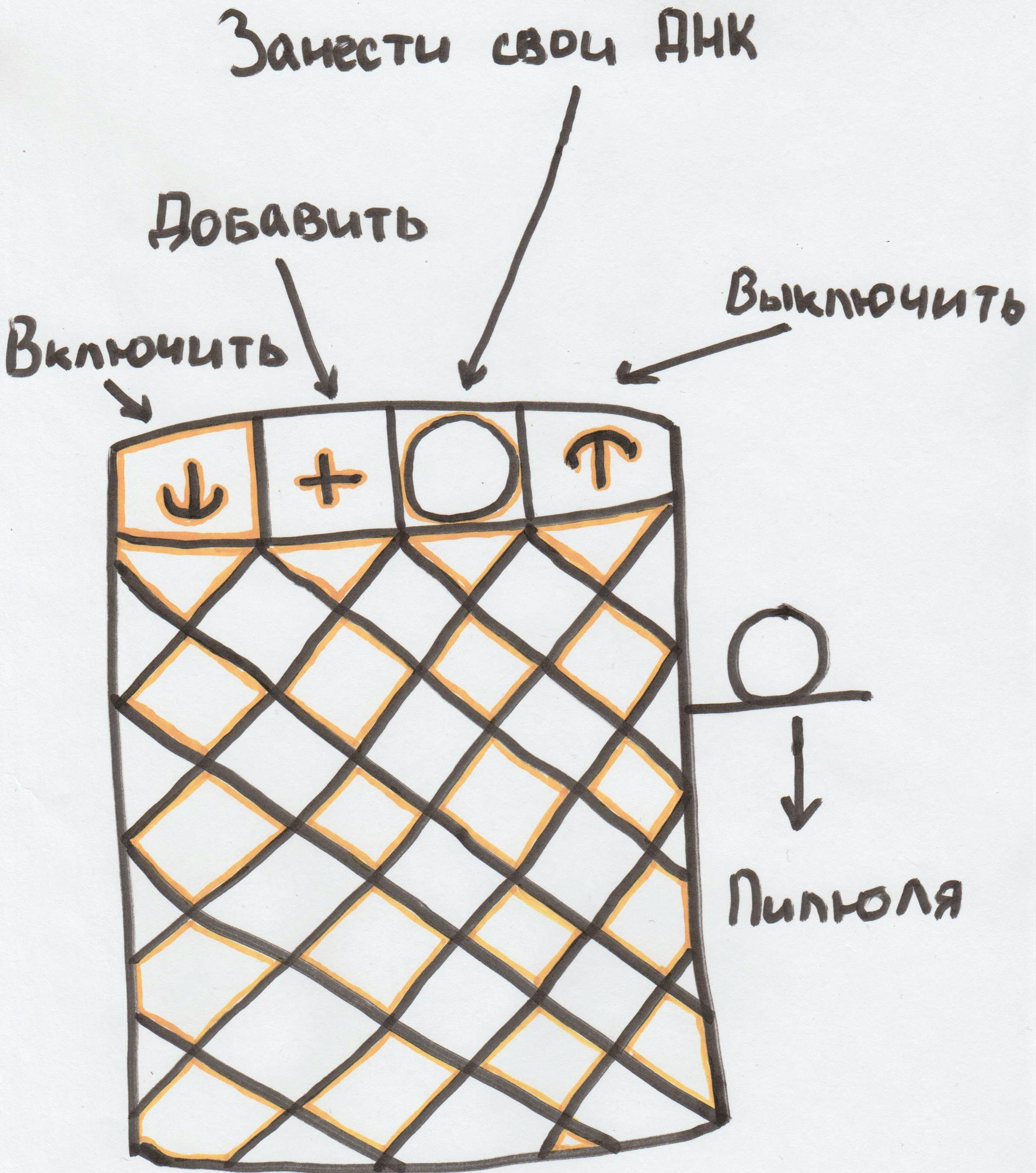 Так как оно работает? Нажимаем на конпку «включить», прикладываем свой палец к сканеру, нажимаем на кнопку «добавить способность» и говорим, какую способность хотите получить. Вам может выпасть пилюля разных цветов и вкусов. Одна штука действует на пять часов.
