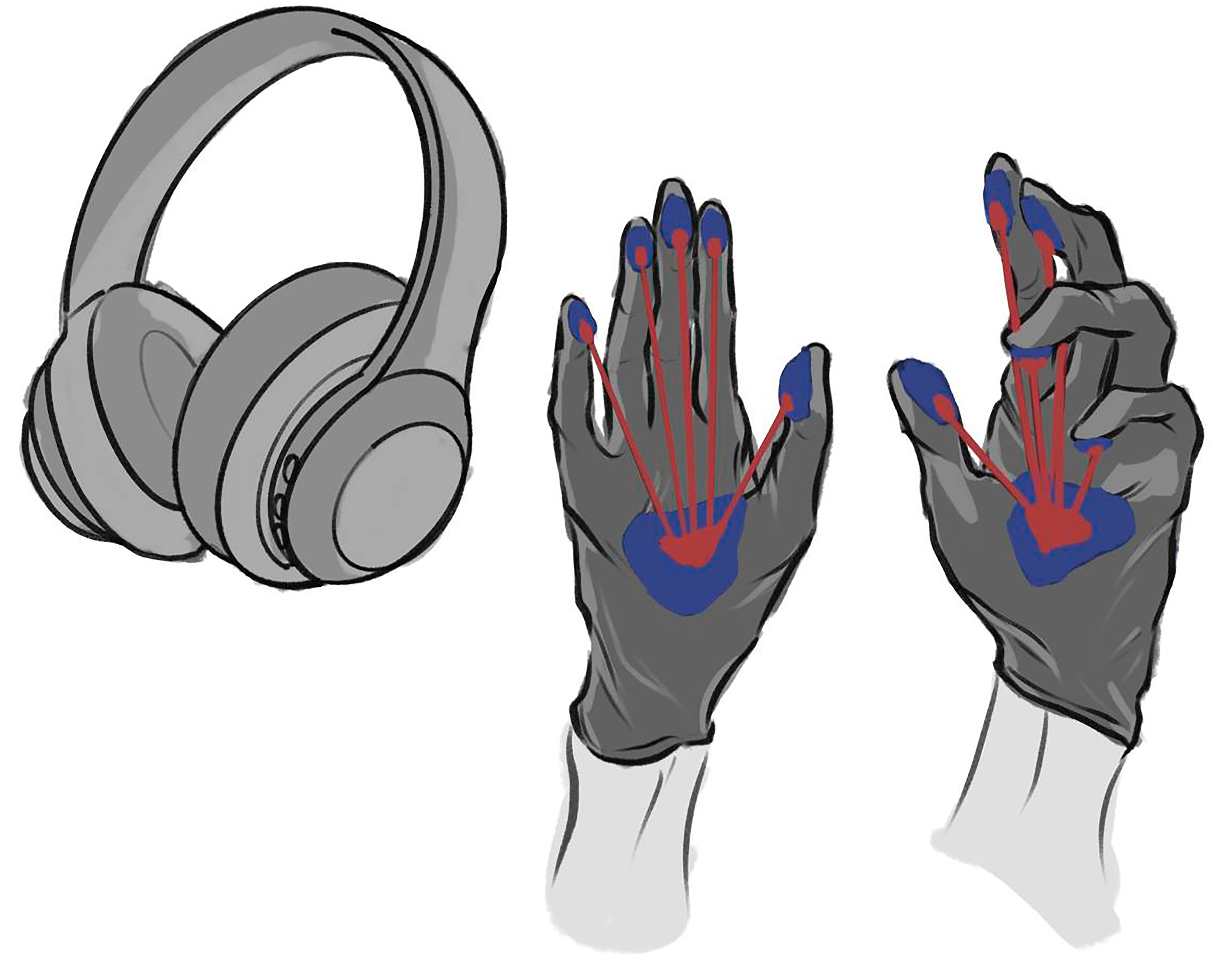 Открыв набор «Перчатка жестов» вы получаете две пары перчаток и наушники соединяющиеся по Bluetooth.