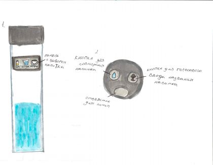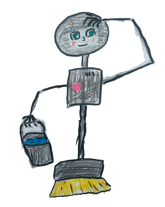 Кнопка «пуск» большая, красная, на голове — светится, когда работает. Железное ведро объемом 5 литров. Само набирает воду из крана. Щётка вместо ног — длинная, мягкая, вращается. Динамик спереди, говорит голосом: «Начинаю уборку!». Железные руки — две штуки, гибкие, как у робота. Хватает тряпки, поднимает вещи. Колёсики внутри щетки — четыре, резиновые, едут по паркету и плитке. Механизм внутри головы — думает, куда ехать. В теле — моторы для щётки и рук. Лицо круглое, с глазами-лампочками. Шелковое сердце в центре — мягкое, розовое, мигает. Заряжается от розетки за 2 часа.