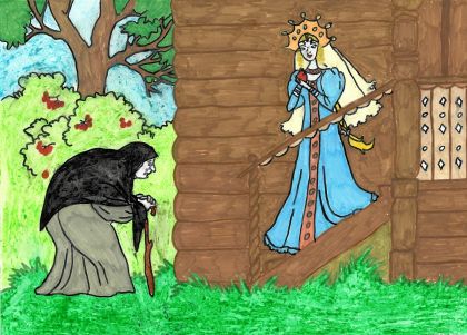 Тогда королева придумала новую хитрость — подослала к Царевне старушку с отравленным яблочком. Откусила Царевна яблочко — и уснула мёртвым сном.