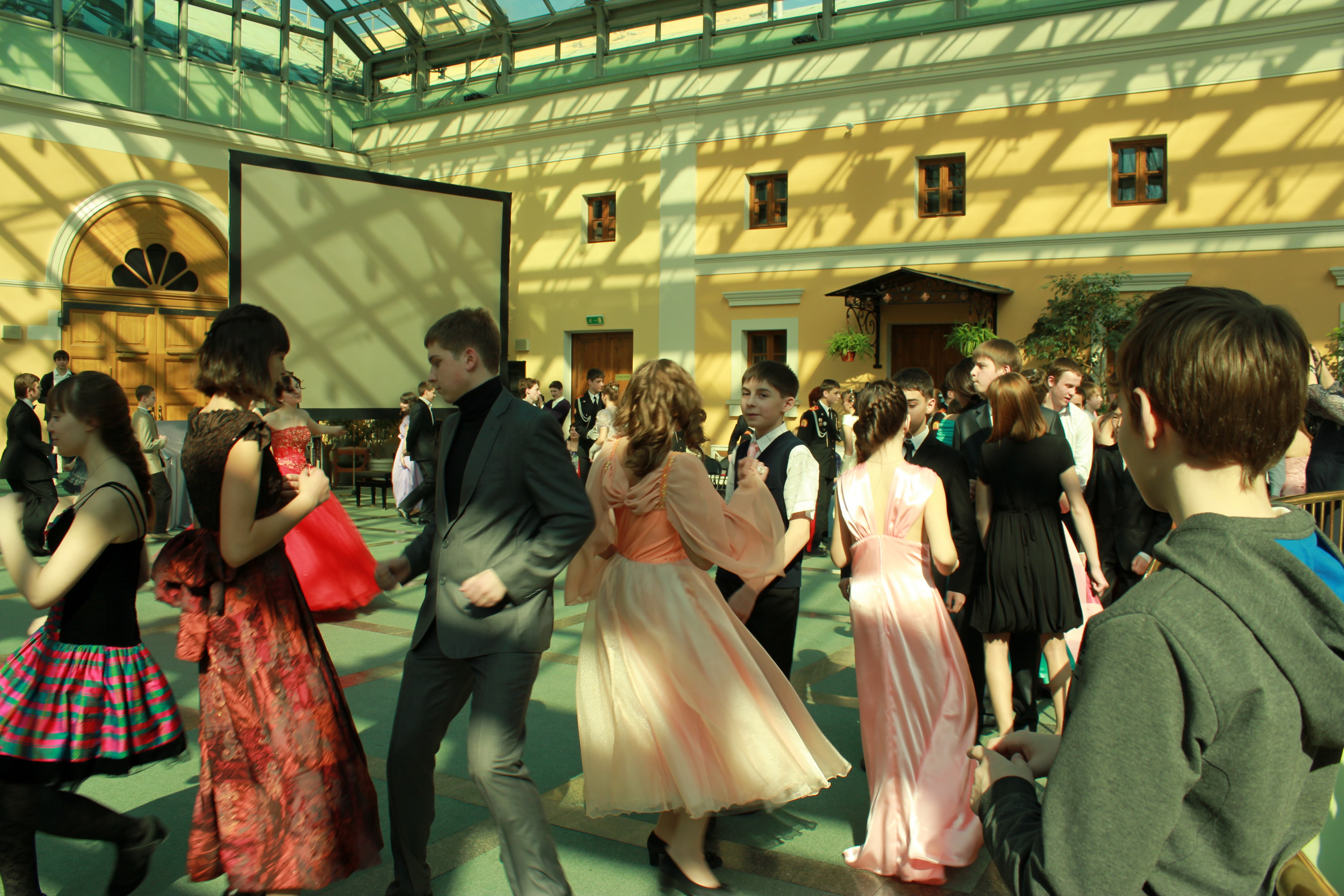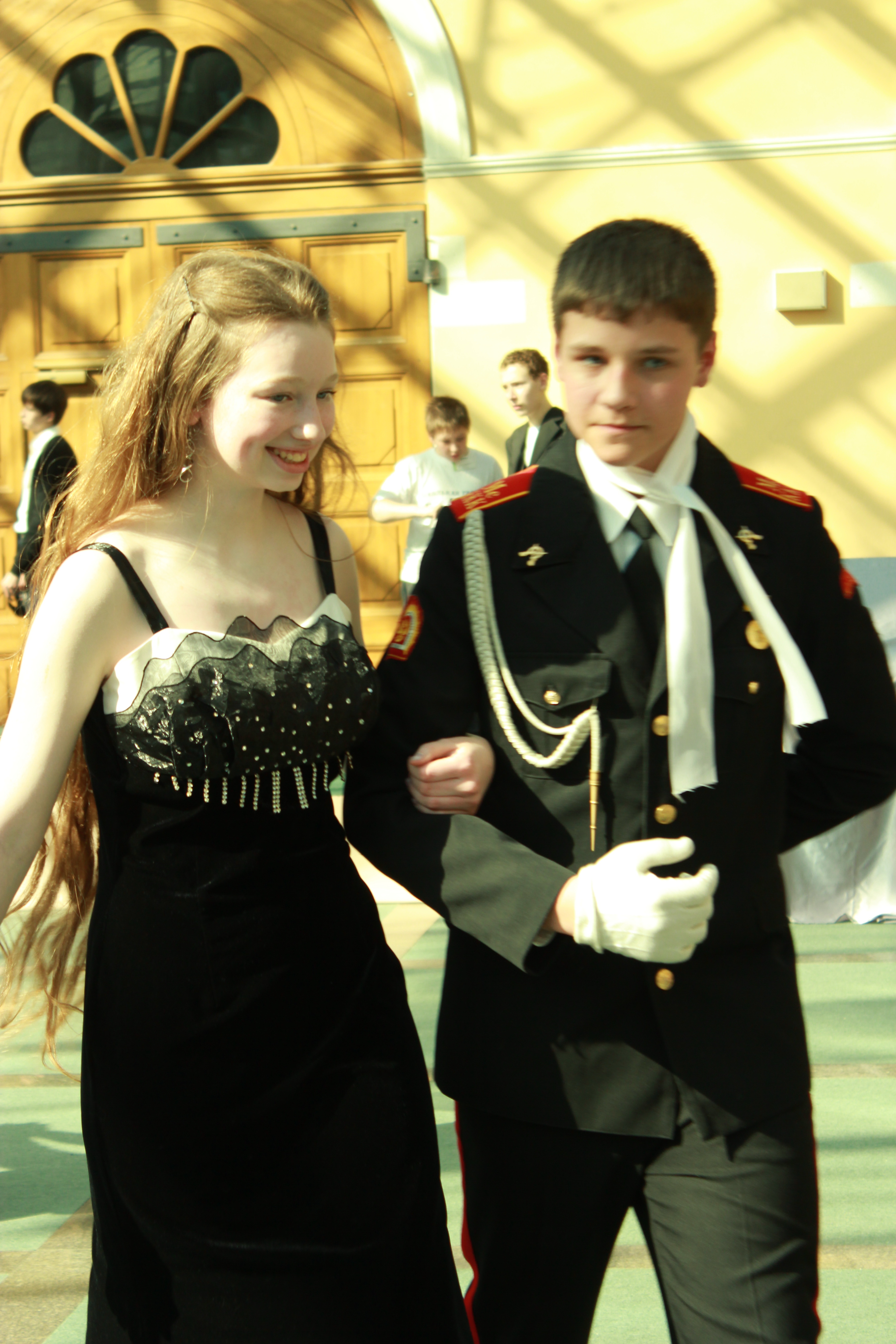 Завершилась церемония традиционным Балом школьной прессы: пышные платья, высокие каблуки, строгие костюмы, — все как положено на балу. Пару юным корреспондентам составили студенты кадетского корпуса.