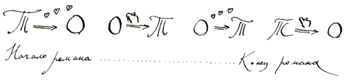 Мои испорченные структурализмом дети привычным движением начали перерисовывать в тетрадки Юлькину схему. — Вот линия романа, — вывела на доске Юлька. — В начале Татьяна пишет Онегину, в финале Онегин пишет Татьяне. В начале Онегин дает Татьяне отповедь, в конце — Татьяна дает отповедь Онегину. Получается: